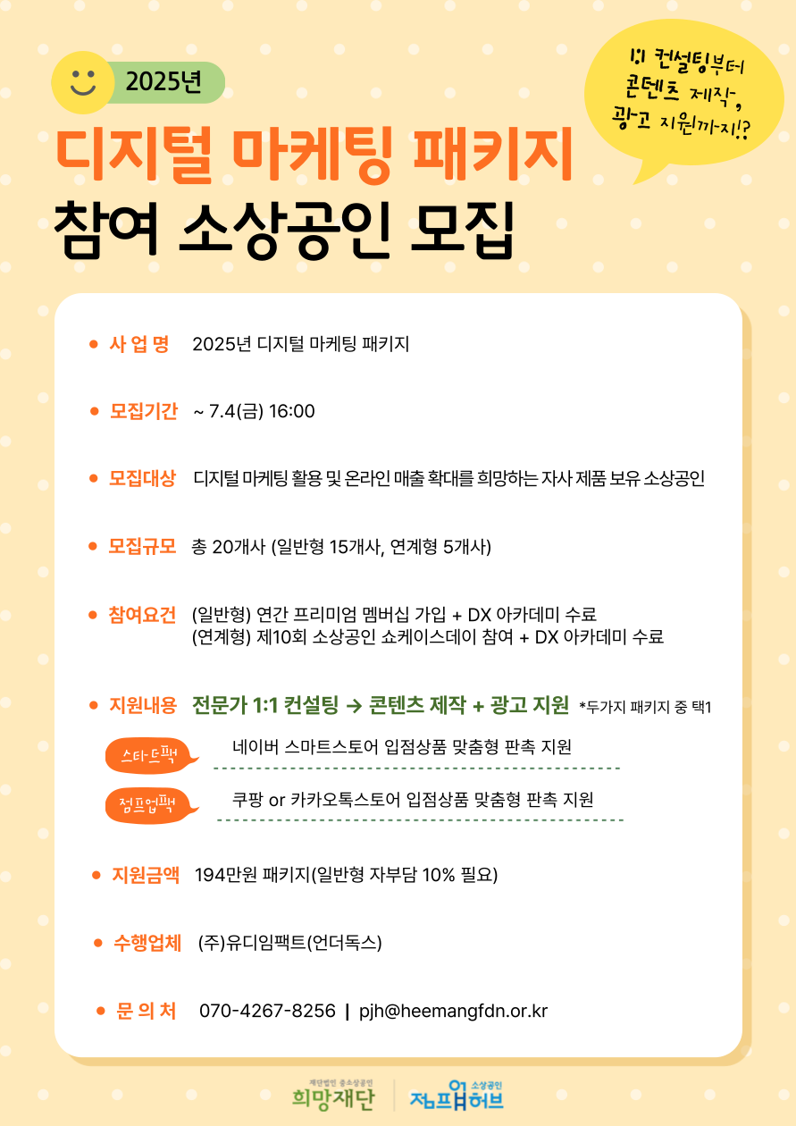 | 지원분야 | 디지털 마케팅(1:1 컨설팅, 콘텐츠 제작, 광고 지원 등) |