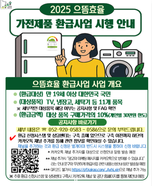 - 11개 품목(냉장고·세탁기·에어컨·TV 등) 대상 고효율 제품 구매 시 구매가의 10%, 최대 30만 원 환급
