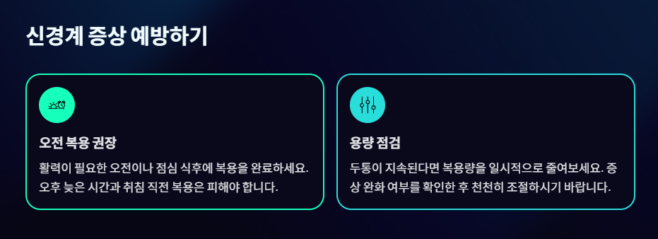 - 용량 점검: 두통이 지속된다면 복용량을 일시적으로 줄여보고, 증상이 완화되는지 확인해야 합니다.