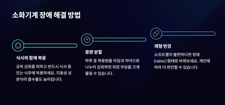 - 복용 시간 조정: CoQ10은 지용성이므로 반드시 식사 중 또는 식후에 섭취해야 합니다. 공복에 섭취하면 부작용 위험이 커지고 흡수율도 낮아집니다.