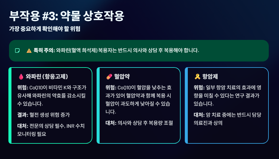 - 위험: **항응고제(혈액 희석제)인 '와파린(Warfarin)'**을 복용하는 환자가 CoQ10을 함께 섭취할 경우, 와파린의 약효를 감소시켜 혈전 생성 위험을 높일 수 있다는 잠재적 위험성이 제기됩니다.
