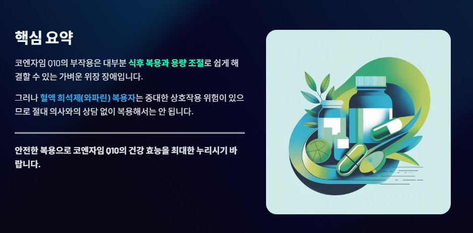 코엔자임 Q10의 주요 부작용은 식후 복용과 용량 조절로 쉽게 해결되는 가벼운 위장 장애가 대부분입니다. 그러나 혈액 희석제(와파린)를 복용 중인 분은 중대한 상호작용 위험이 있으므로 절대 의사와의 상담 없이 복용해서는 안 됩니다.