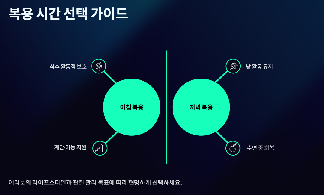 식사 직후라는 큰 원칙을 정했다면, 이제 아침과 저녁 중 어느 시간이 나에게 더 이득인지 선택할 차례입니다. 이는 여러분의 라이프스타일과 관절 관리 목표에 따라 달라질 수 있습니다.