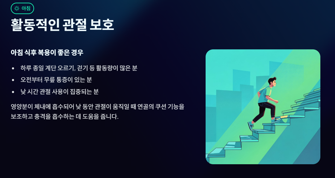 - 매일 같은 시간이 중요해요: 흡수율이나 회복 속도만큼 중요한 것이 꾸준함입니다. 매일 다른 시간에 들쭉날쭉하게 먹는 것보다는, 아침 식후든 저녁 식후든 나에게 편안한 시간을 정해 규칙적으로 섭취하는 것이 장기적인 관절 건강에 가장 큰 도움이 됩니다.