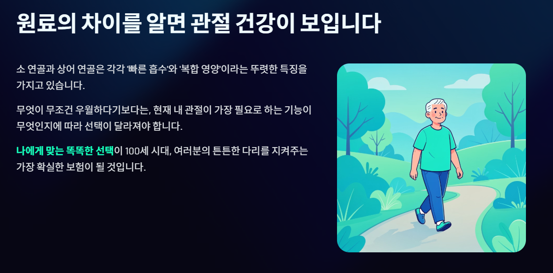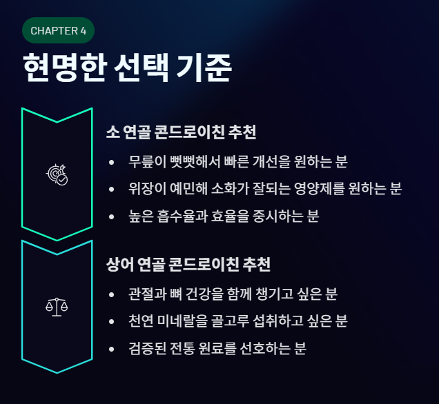 만약 여러분이 **"무릎이 너무 뻣뻣해서 하루라도 빨리 부드러워졌으면 좋겠다"**거나 **"평소 위장이 예민해서 소화가 잘되는 영양제를 원한다"**면 소 연골 콘드로이친을 추천합니다. 인체 구조와 비슷해 몸에 부담이 적고 효율이 높기 때문입니다.