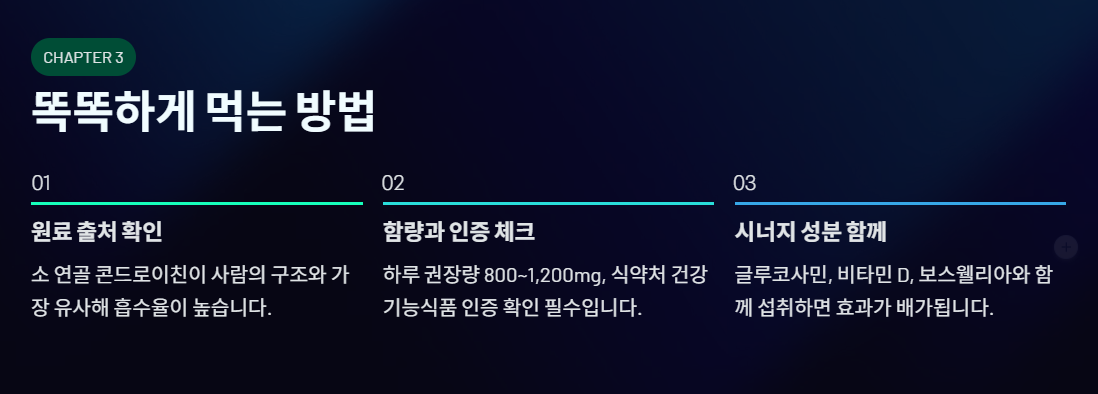 - 함께 먹으면 좋은 단짝들: 연골의 또 다른 구성 성분인 글루코사민, 뼈 건강을 돕는 비타민 D, 염증 완화에 좋은 보스웰리아 등과 함께 섭취하면 훨씬 큰 시너지 효과를 볼 수 있습니다.