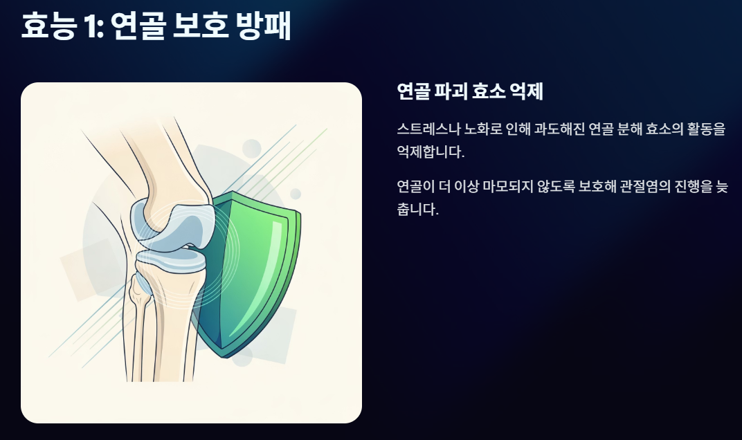 우리 몸속에는 연골을 분해하는 나쁜 효소들이 있습니다. 스트레스나 노화로 인해 이 효소들이 과도해지면 연골이 얇아지고 닳게 되죠. 콘드로이친은 이러한 연골 파괴 효소의 활동을 억제하는 방패 역할을 합니다. 연골이 더 이상 마모되지 않도록 보호해줌으로써 관절염의 진행을 늦추는 데 실질적인 도움을 줍니다.