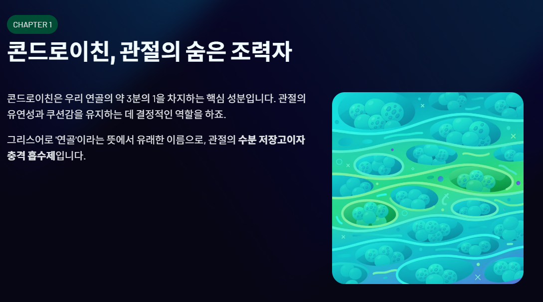 연골은 뼈와 뼈 사이에서 마찰을 줄여주는 쿠션 역할을 하는데, 콘드로이친은 이 연골 속으로 수분과 영양분을 끌어당겨 연골을 탄력 있게 유지해 줍니다. 안타깝게도 이 성분은 20대부터 줄어들기 시작해 40대가 되면 절반 이하로 급감하고, 70대에는 거의 사라지게 됩니다. 우리가 나이가 들수록 관절이 뻣뻣해지고 통증을 느끼는 이유가 바로 이 콘드로이친의 소실과 깊은 관련이 있습니다.