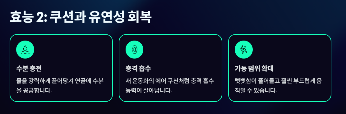 앞서 말씀드렸듯 콘드로이친은 물을 강력하게 끌어당기는 성질이 있습니다. 연골이 충분한 수분을 머금게 되면 마치 새 운동화의 에어 쿠션처럼 충격 흡수 능력이 살아납니다. 덕분에 관절을 움직일 때 느껴지는 뻣뻣함이 줄어들고, 가동 범위가 넓어져 훨씬 부드럽게 움직일 수 있게 됩니다. "무릎이 부드러워졌다"는 후기들이 나오는 이유가 바로 이 수분 충전 효과 덕분입니다.