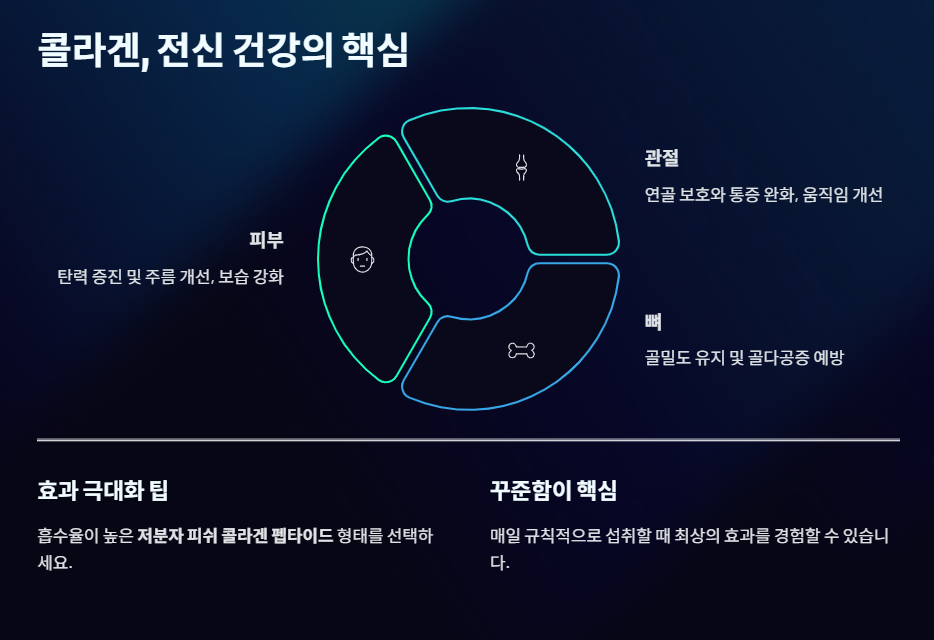 이 글에서는 콜라겐 보충이 제공하는 3가지 핵심 효능을 과학적 근거를 바탕으로 상세히 분석하고, 전신 건강에 미치는 긍정적인 영향까지 명확하게 알려드립니다.