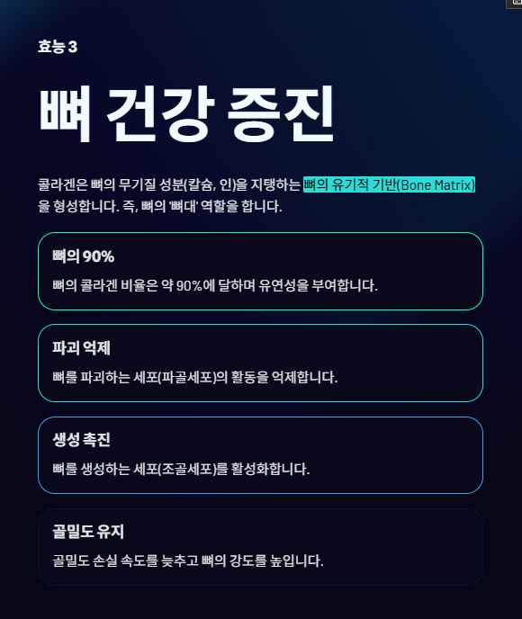 콜라겐은 뼈의 무기질 성분(칼슘, 인)을 지탱하는 **뼈의 유기적 기반(Bone Matrix)**을 형성합니다. 즉, 뼈의 '뼈대' 역할을 합니다.