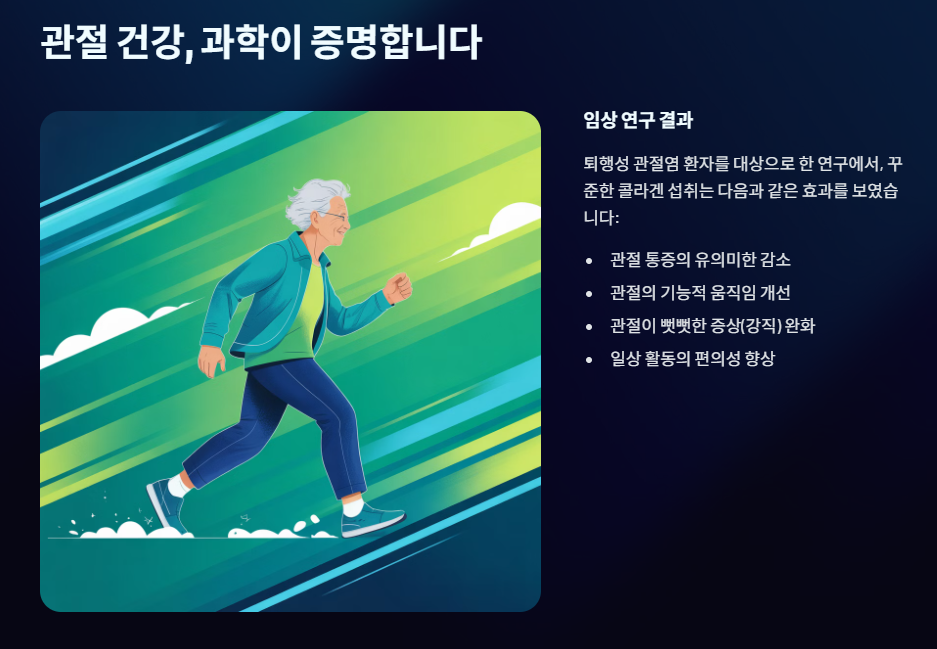 • 효능: 퇴행성 관절염 환자를 대상으로 한 연구에서, 꾸준한 콜라겐 섭취는 관절 통증을 감소시키고 관절의 기능적 움직임을 개선하는 데 긍정적인 영향을 미치는 것으로 나타났습니다. 특히 관절이 뻣뻣한 증상(강직) 완화에 도움을 줄 수 있습니다.