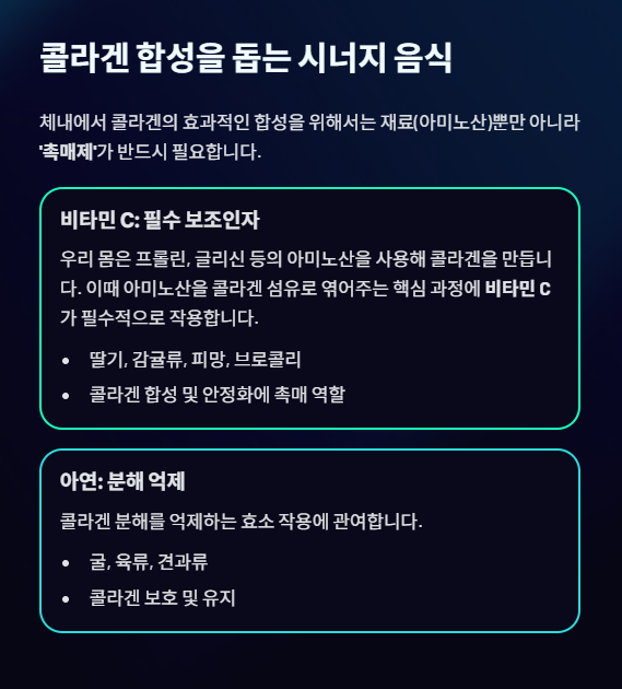 | 성분 | 대표 음식 | 콜라겐과의 관계 |