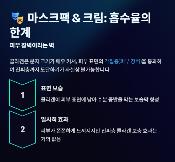 콜라겐은 분자 크기가 매우 커서, 피부 표면의 **각질층(피부 장벽)**을 통과하여 진피층까지 도달하기가 사실상 불가능합니다. (특정 나노/리포좀 기술을 적용해도 한계가 있음.)