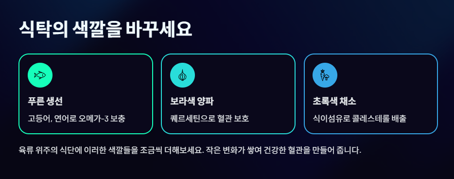 콜레스테롤 관리는 **'식탁의 색깔'**을 바꾸는 것에서 시작됩니다. 오늘부터 육류 위주의 식단에 푸른 생선, 보라색 양파, 초록색 채소를 조금씩 더해보세요. 이러한 작은 변화가 쌓여 건강한 혈관 성적표를 만들어 줄 것입니다.