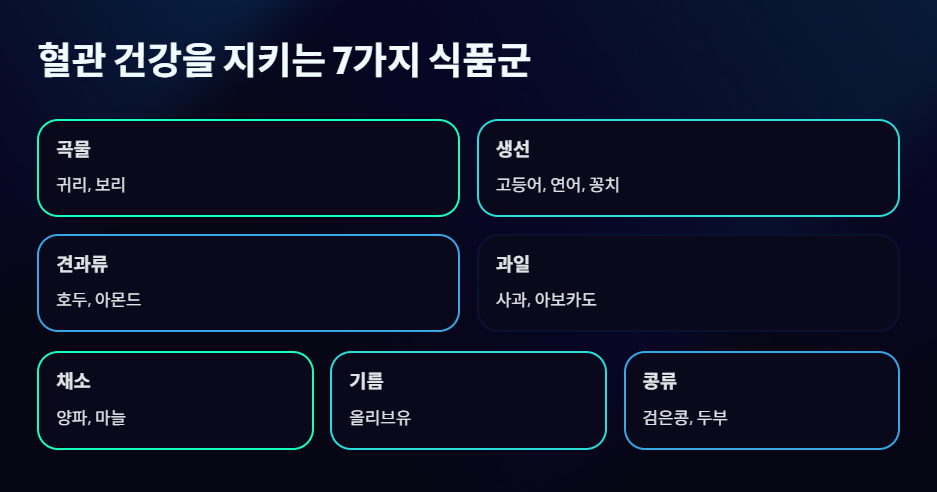 | 견과류 | 호두, 아몬드 | 불포화지방산 | 혈관 벽을 튼튼하게 하고 LDL 배출 촉진 |