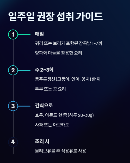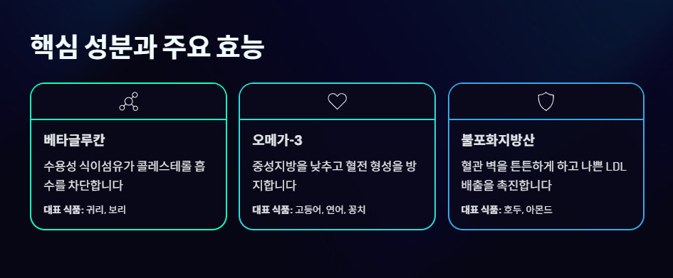| 곡물 | 귀리(오트밀), 보리 | 베타글루칸 | 수용성 식이섬유가 콜레스테롤 흡수를 차단 |