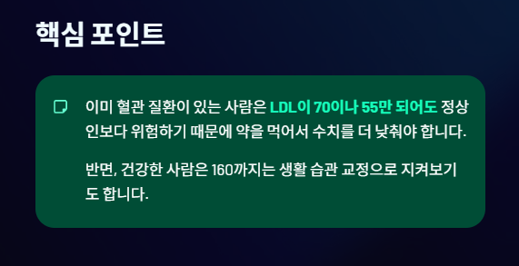 💡 핵심: 이미 혈관 질환이 있는 사람은 LDL이 70이나 55만 되어도 정상인보다 위험하기 때문에 약을 먹어서 수치를 더 낮춰야 합니다. 반면, 건강한 사람은 160까지는 생활 습관 교정으로 지켜보기도 합니다.