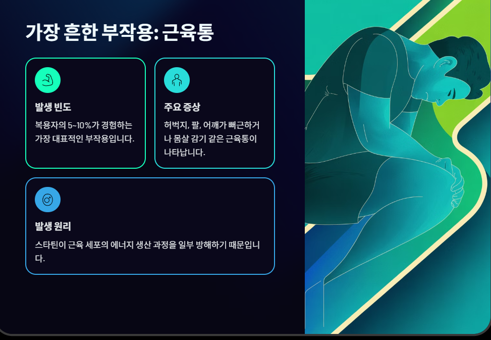1. 🦵 가장 흔한 부작용: 근육통 및 근육 약화 (Myalgia)