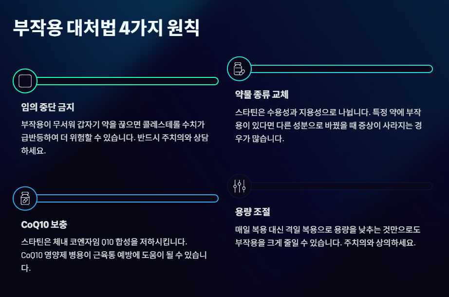 - 약물 종류 교체: 스타틴도 성분에 따라 '수용성'과 '지용성'으로 나뉩니다. 특정 약에 부작용이 있다면 다른 성분으로 바꿨을 때 증상이 사라지는 경우가 많습니다.