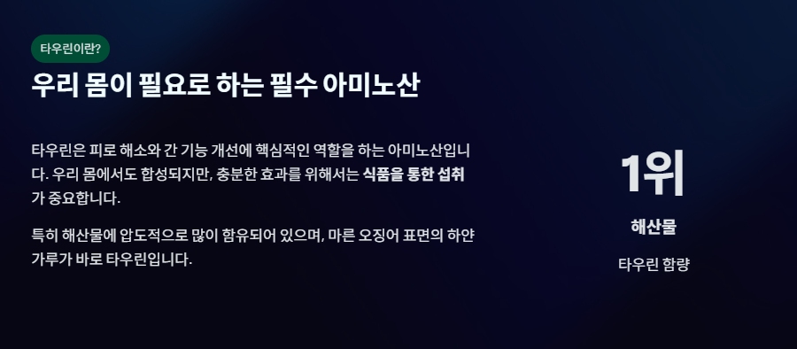 타우린은 피로 해소와 간 기능 개선에 필수적인 아미노산입니다. 우리 몸에서 합성되기도 하지만, 충분한 효과를 보기 위해서는 음식을 통해 섭취하는 것이 가장 좋습니다.