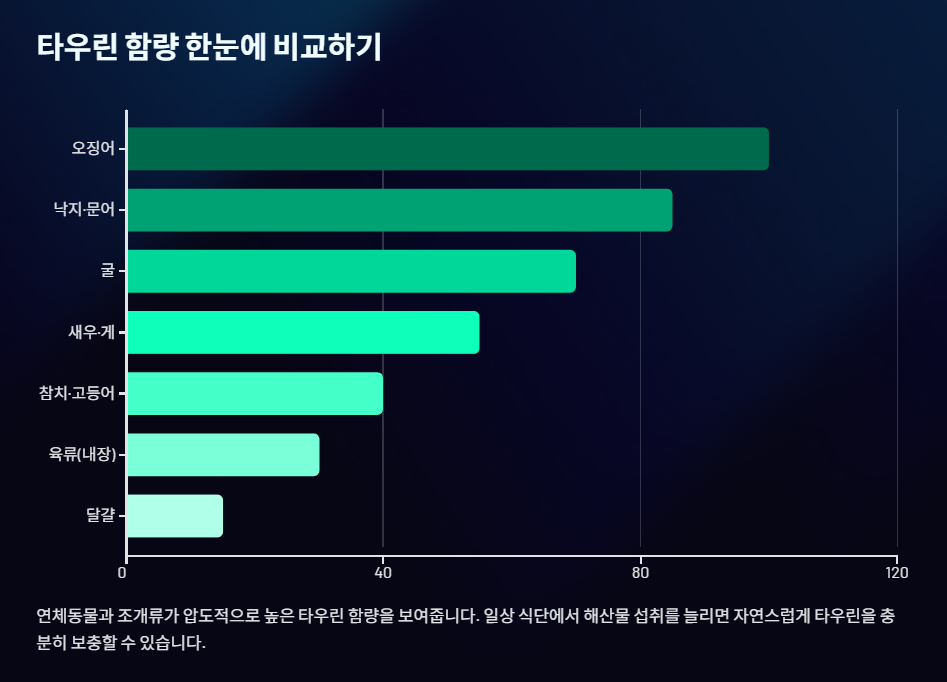 타우린은 특히 해산물에 압도적으로 풍부하며, 일상에서 쉽게 접할 수 있는 타우린 함량이 높은 식품들을 정리해 드립니다.
