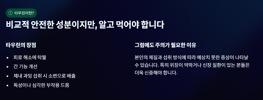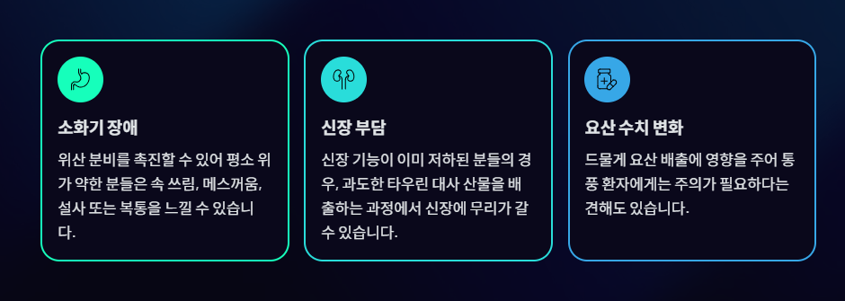 - 신장 부담: 신장 기능이 이미 저하된 분들의 경우, 과도한 타우린 대사 산물을 배출하는 과정에서 신장에 무리가 갈 수 있습니다.