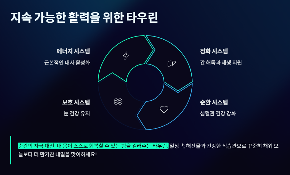 타우린은 피로를 푸는 에너지 대사 핵심 성분입니다. 간 해독, 심장 강화, 눈 건강을 돕는 만능 조절제로, 해산물로 쉽게 보충하여 지속 가능한 활력을 얻을 수 있습니다.