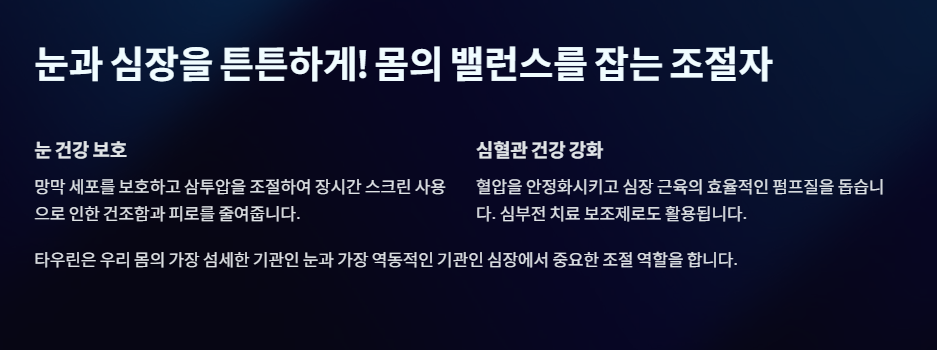 타우린은 우리 몸의 가장 섬세한 기관인 눈과 가장 역동적인 기관인 심장에서도 중요한 조절 역할을 합니다.