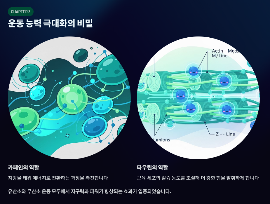 운동선수들이나 헬스를 즐기는 분들에게 이 조합은 꽤 매력적입니다. 연구에 따르면 카페인이 지방을 태워 에너지로 쓰는 것을 돕는 동안, 타우린은 근육 세포 안의 칼슘 농도를 조절해 근육이 더 강한 힘을 낼 수 있게 합니다. 실제로 사이클이나 달리기 같은 유산소 운동은 물론, 순간적인 힘을 쓰는 무산소 운동에서도 두 성분을 함께 섭취했을 때 지구력과 파워가 더 향상되었다는 결과가 많습니다.