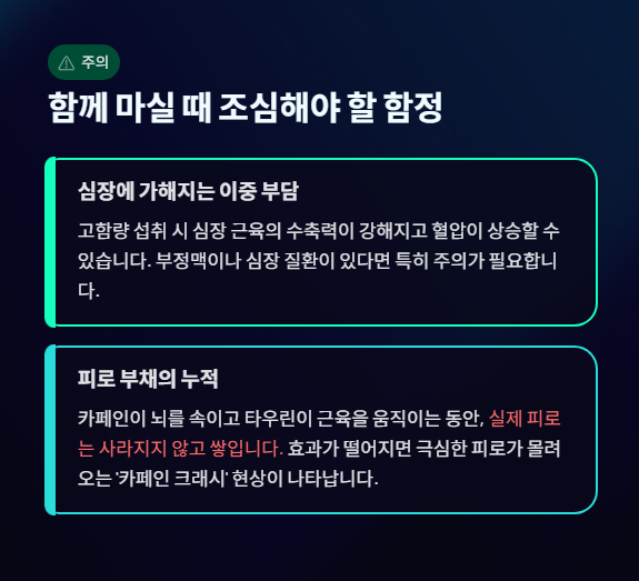 세상에 완벽한 조합은 없듯이, 타우린과 카페인의 만남에도 주의해야 할 점이 분명히 있습니다. 특히 우리가 무심코 마시는 에너지 음료의 형태일 때 더 그렇습니다.