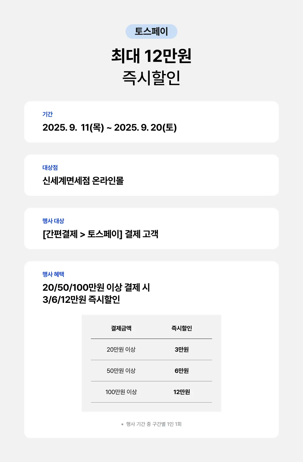• 최소 결제금액이 **25만원 이상**, 그리고 이벤트 기간 중 첫 결제 1건에만 적용됨.