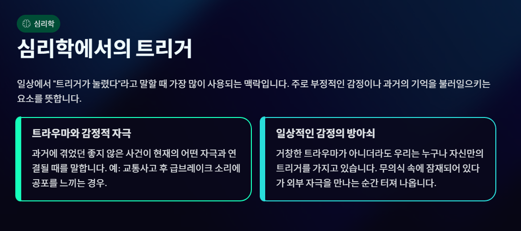 우리가 일상에서 "트리거가 눌렸다"라고 말할 때 가장 많이 사용되는 맥락이 바로 심리학적 관점입니다. 여기서는 주로 부정적인 감정이나 과거의 기억을 불러일으키는 요소를 뜻합니다.