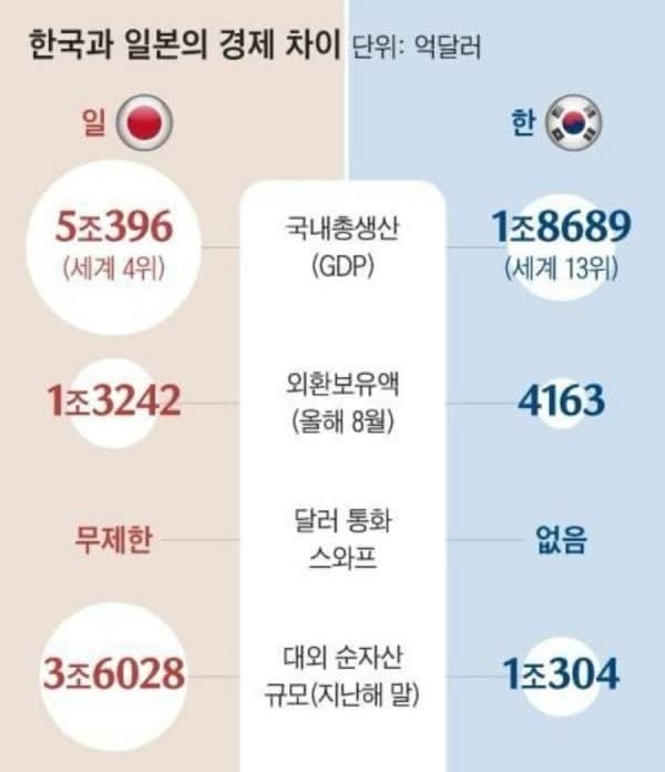 - 2023년 기준, 일본의 GDP는 약 4조 달러, 한국은 약 1.7조 달러 수준입니다.
