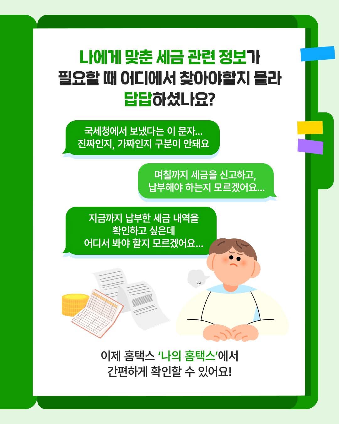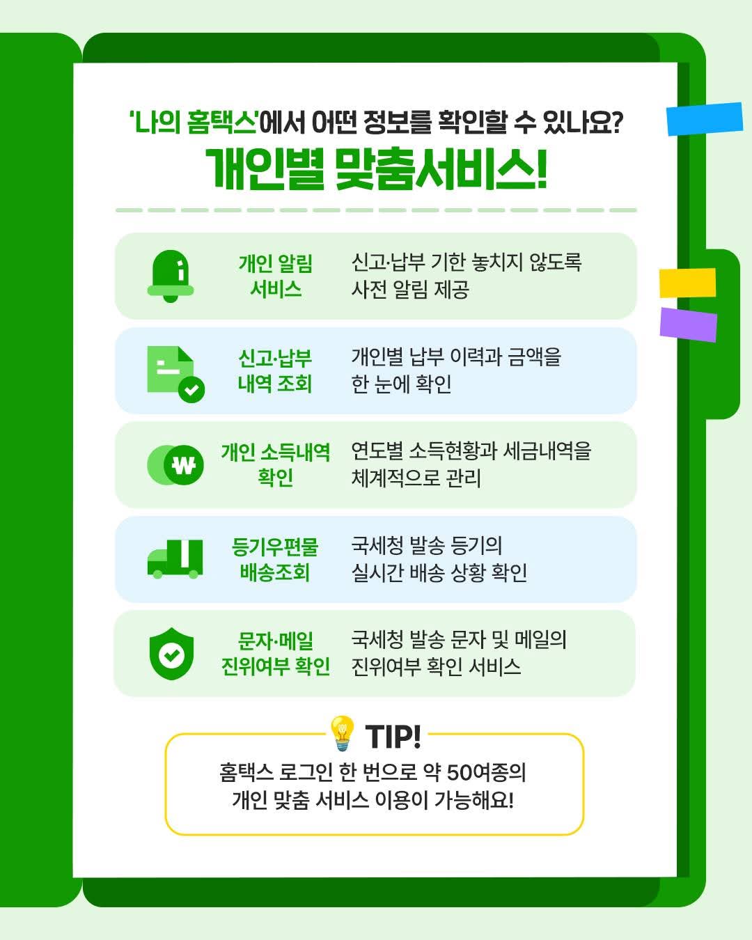 - 개인 알림 서비스: 세금 신고·납부 기한, 환급금 발생 여부 등 안내
