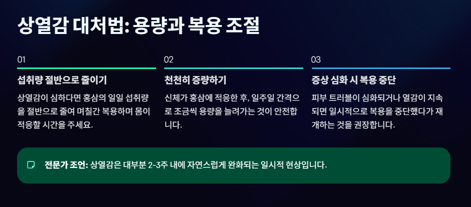 - 용량 조절: 상열감이 심하다면 홍삼의 일일 섭취량을 절반으로 줄여 며칠간 복용하며 몸이 적응할 시간을 주세요. 이후 천천히 증량하는 것이 안전합니다.