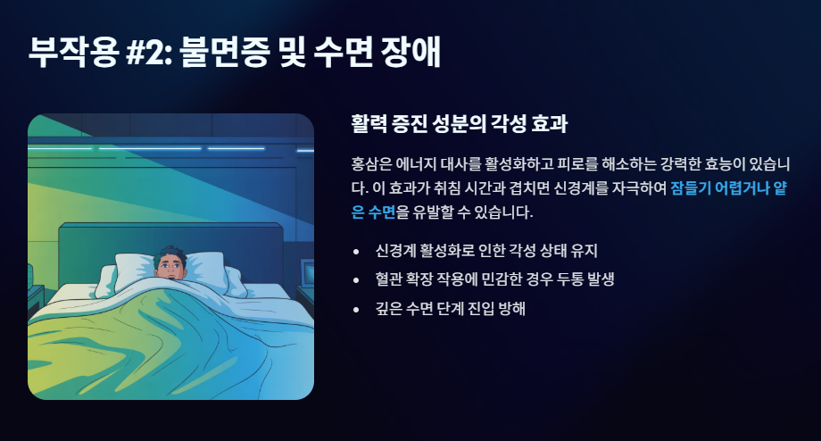 홍삼의 활력 증진 효과가 수면 시간과 충돌할 때 발생하는 부작용입니다.