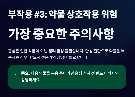 - 솔루션: 해당 약물을 복용 중인 경우, 반드시 전문의와 상담 후 복용 여부를 결정하고, 복용 시에는 약물과 홍삼을 시간 간격을 두고 섭취해야 합니다.