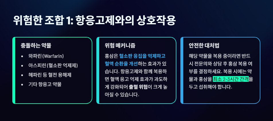 - 충돌 위험: 홍삼은 혈소판 응집을 억제하고 혈액 순환을 개선하는 효과가 있습니다. 따라서 **아스피린, 와파린 등 혈액 응고를 방지하는 약물(항응고제, 혈전 용해제)**과 함께 복용하면 출혈 위험을 높일 수 있습니다.
