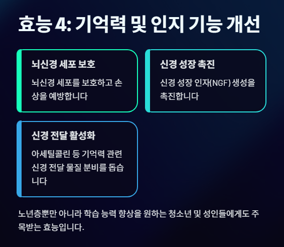 - 작용 원리: 홍삼 성분은 뇌신경 세포를 보호하고, 신경 성장 인자(NGF) 생성을 촉진하며, 기억력에 관여하는 아세틸콜린 등의 신경 전달 물질 분비를 돕습니다.