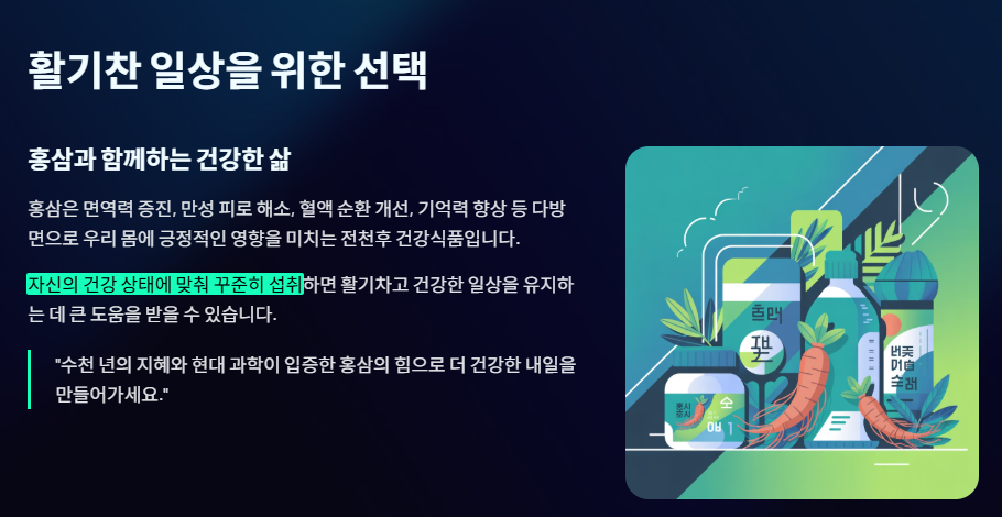 - 효능: 홍삼은 단순한 각성 효과가 아닌, 신체 대사 활동의 효율을 높여 피로 물질의 축적을 줄이고 회복 속도를 빠르게 합니다. 이로 인해 만성 피로와 무기력증을 개선하고 전신 활력을 증진시키는 효과를 기대할 수 있습니다.