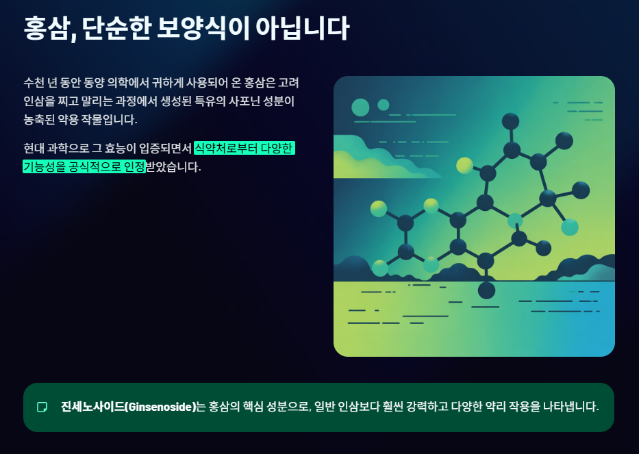 홍삼의 핵심 성분인 **진세노사이드(Ginsenoside)**는 원료인 인삼(수삼)에는 없는 특이 성분들이 다량 함유되어 있어, 인삼보다 훨씬 강력하고 다양한 약리 작용을 나타냅니다.