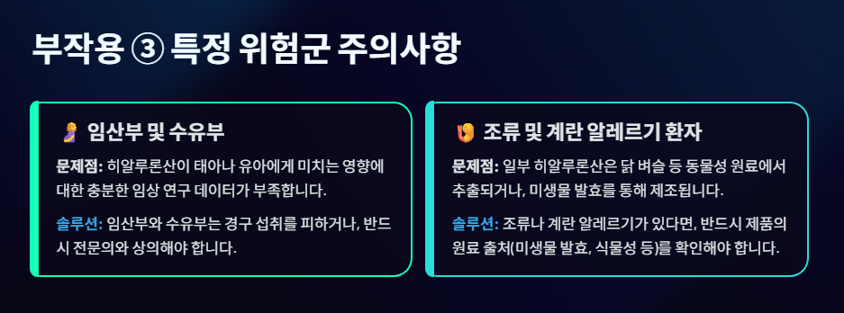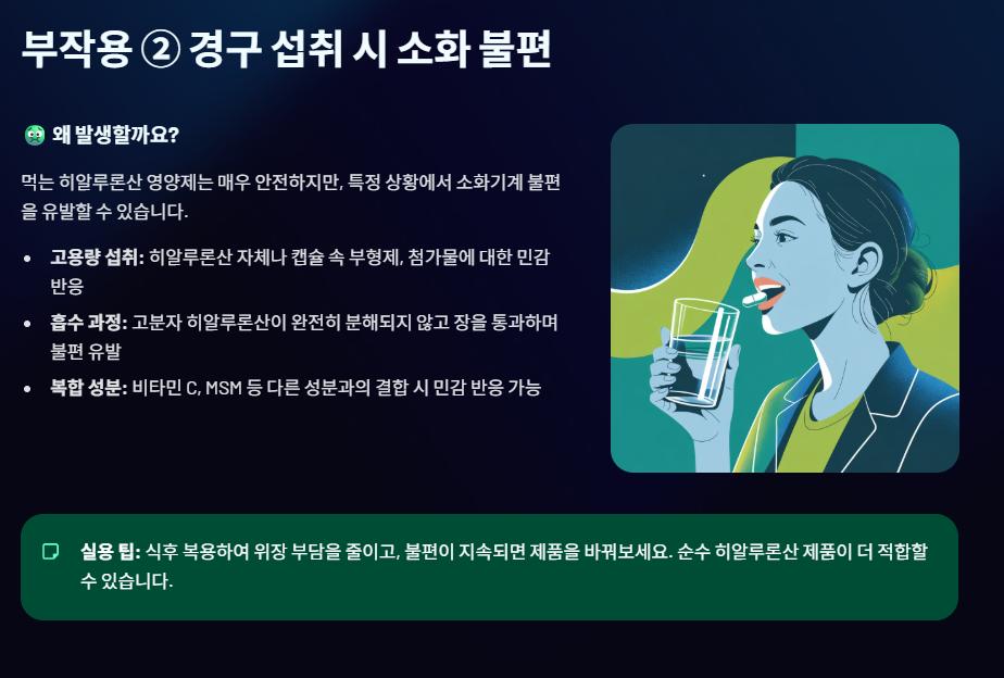 하지만 아무리 안전한 히알루론산이라도, 섭취 방식이나 제형, 그리고 특정 신체 상태에 따라 주의해야 할 부작용이 있습니다.