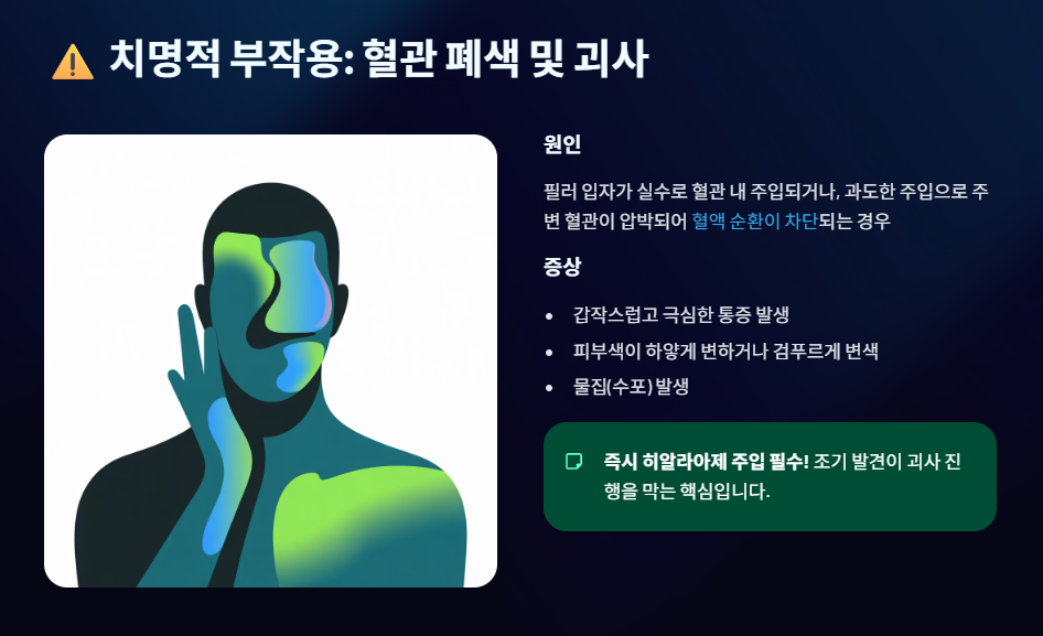 이 부작용들은 즉시 의료 조치가 이루어지지 않으면 괴사나 실명 등 영구적인 손상을 초래할 수 있습니다.