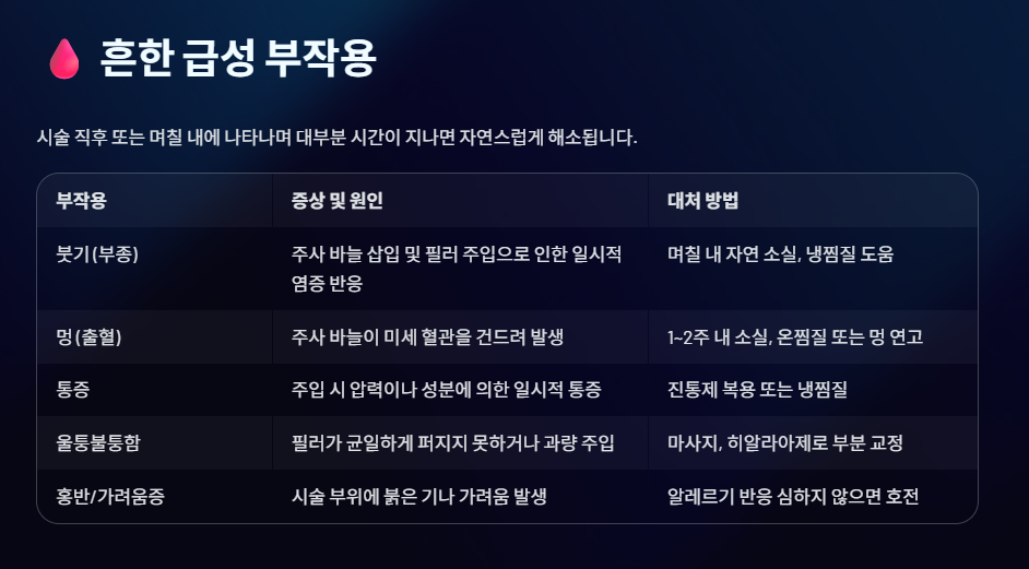 | 홍반 및 가려움증 | 시술 부위에 붉은 기가 돌거나 가려움을 느낌. | 알레르기 반응이 심하지 않으면 시간이 지나면서 호전. |