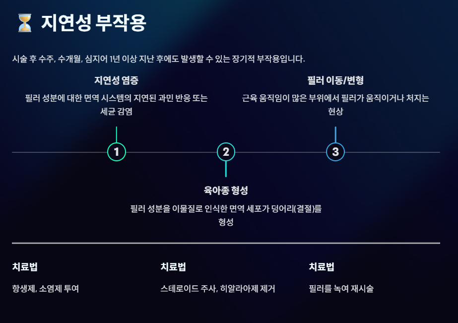 | 육아종 형성 | 필러 성분을 이물질로 인식한 면역 세포가 덩어리(결절)를 형성함. | 스테로이드 주사 치료, 또는 히알라아제로 녹여 제거. |