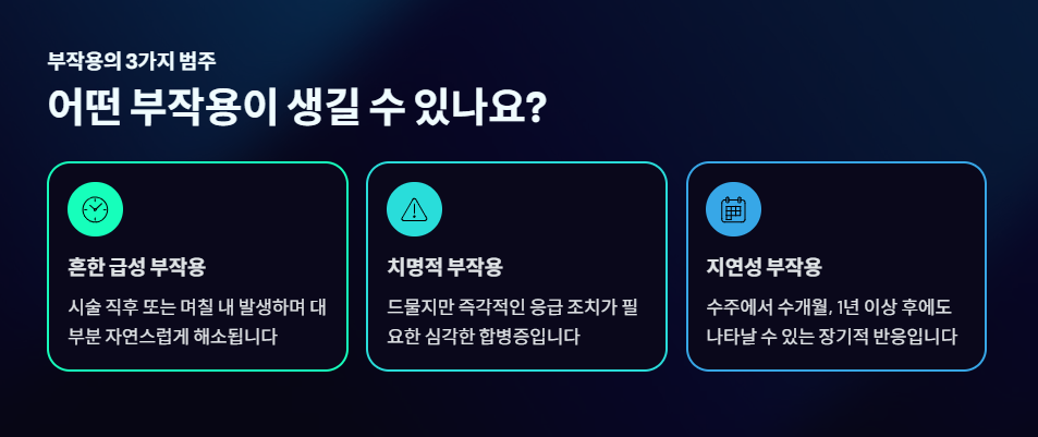 히알루론산 필러 시술 시 나타날 수 있는 부작용을 흔한 급성 부작용, 드물지만 심각한 치명적 부작용, 지연성 부작용으로 나누어 상세히 정리했습니다.