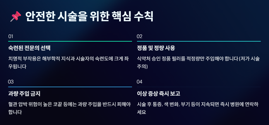- 과량 주입 금지: 특히 혈관 압박으로 인한 괴사 위험이 높은 코끝 등에는 과량 주입을 피해야 합니다.