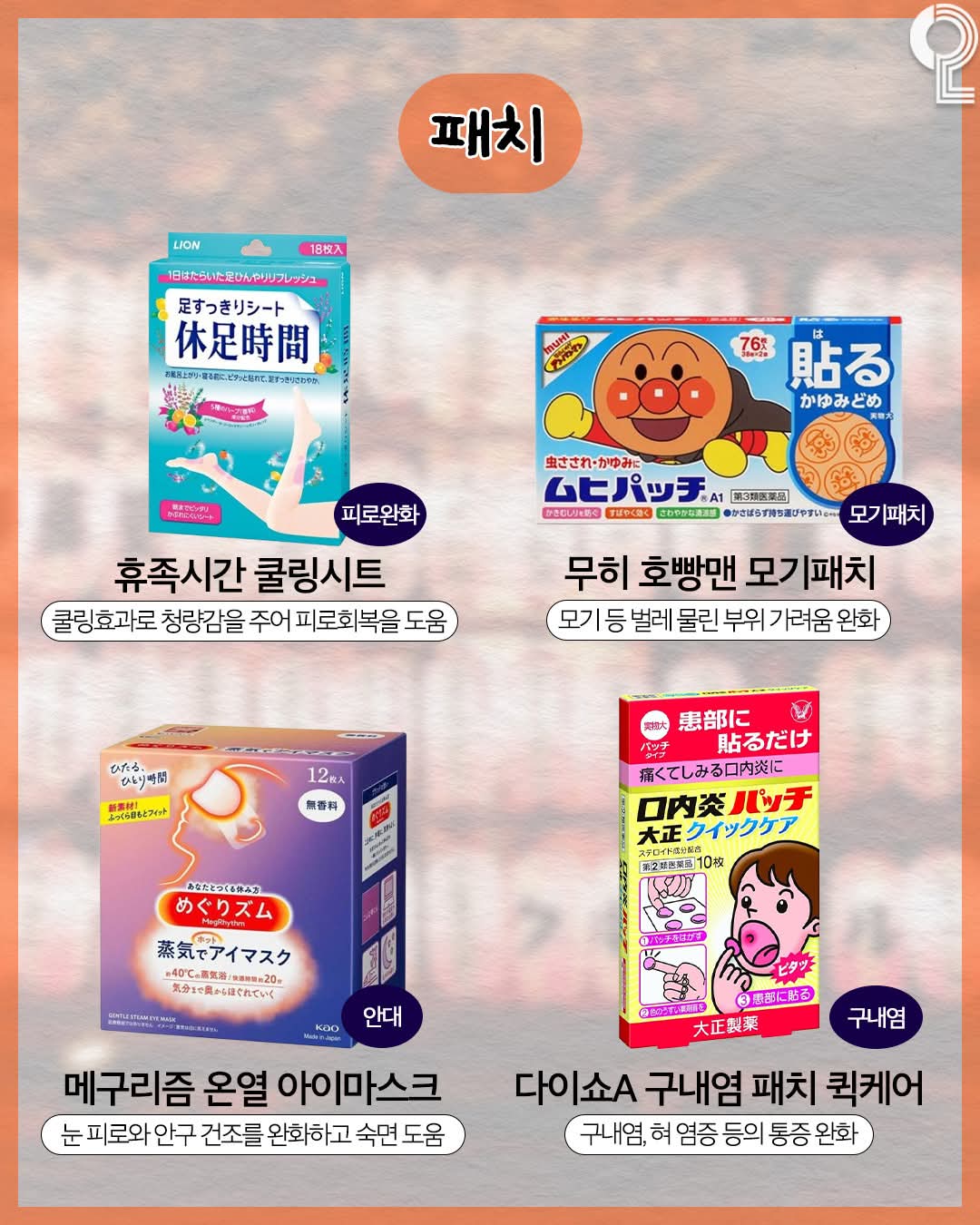 | 피로 회복 | 휴족시간 쿨링시트 | 쿨링 효과와 청량감으로 피로 회복에 도움 |