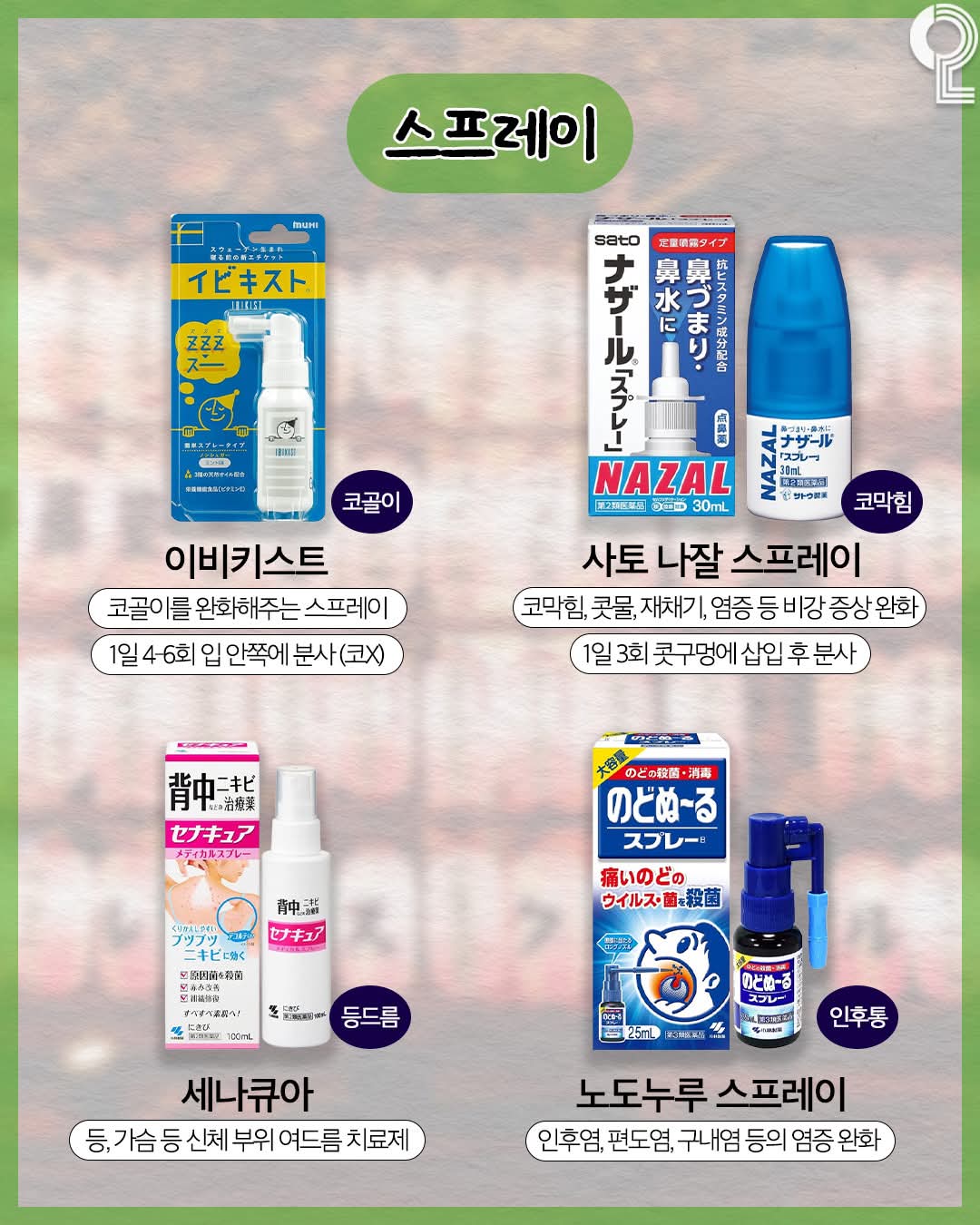 | 인후통 | 노도루루 스프레이 | 인후염, 편도염, 구내염 등의 염증 완화 |
